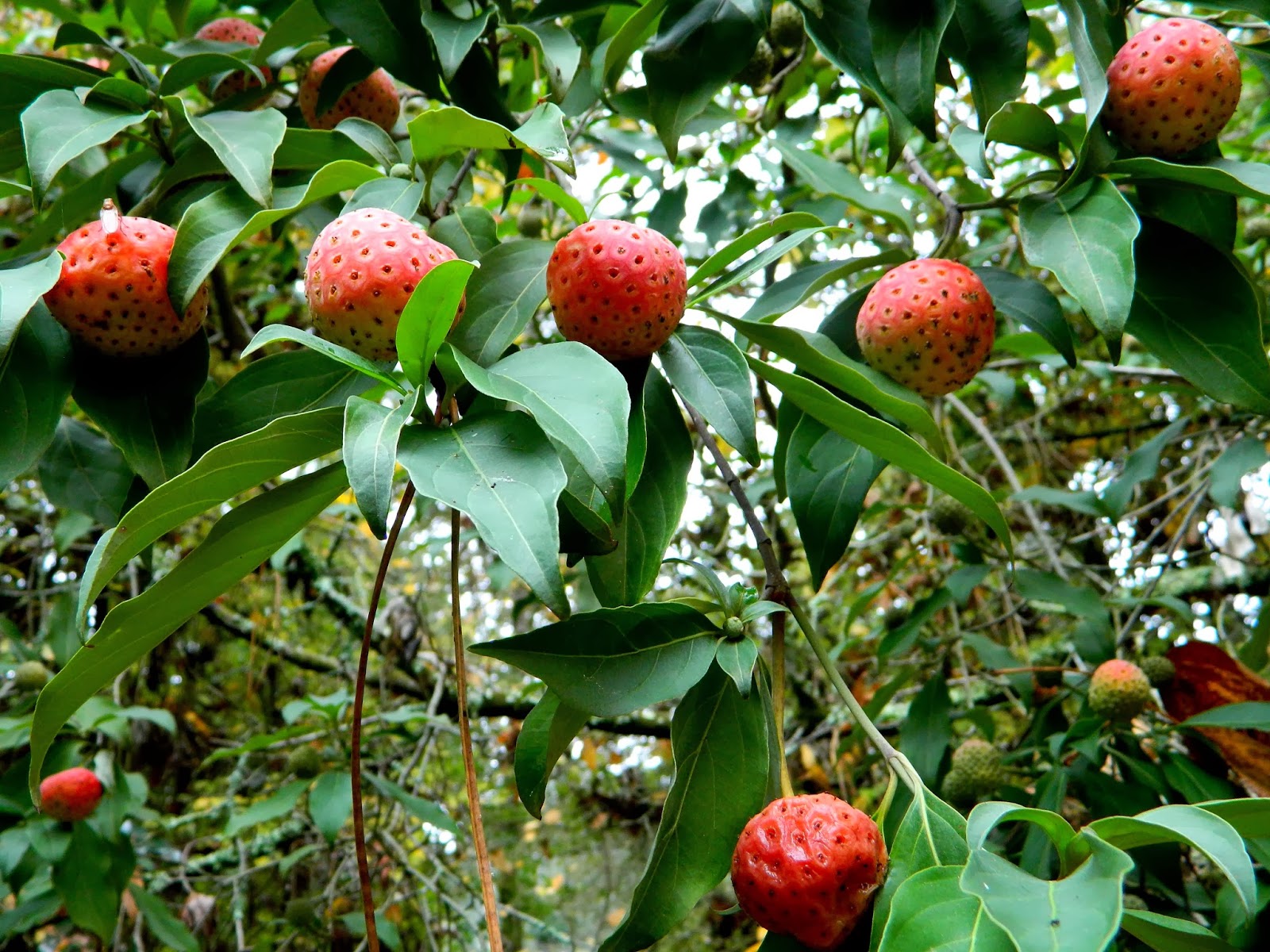 | Las bayas del Cornus Capitata. Similares a los fresones. ¡Pero no lo son! |