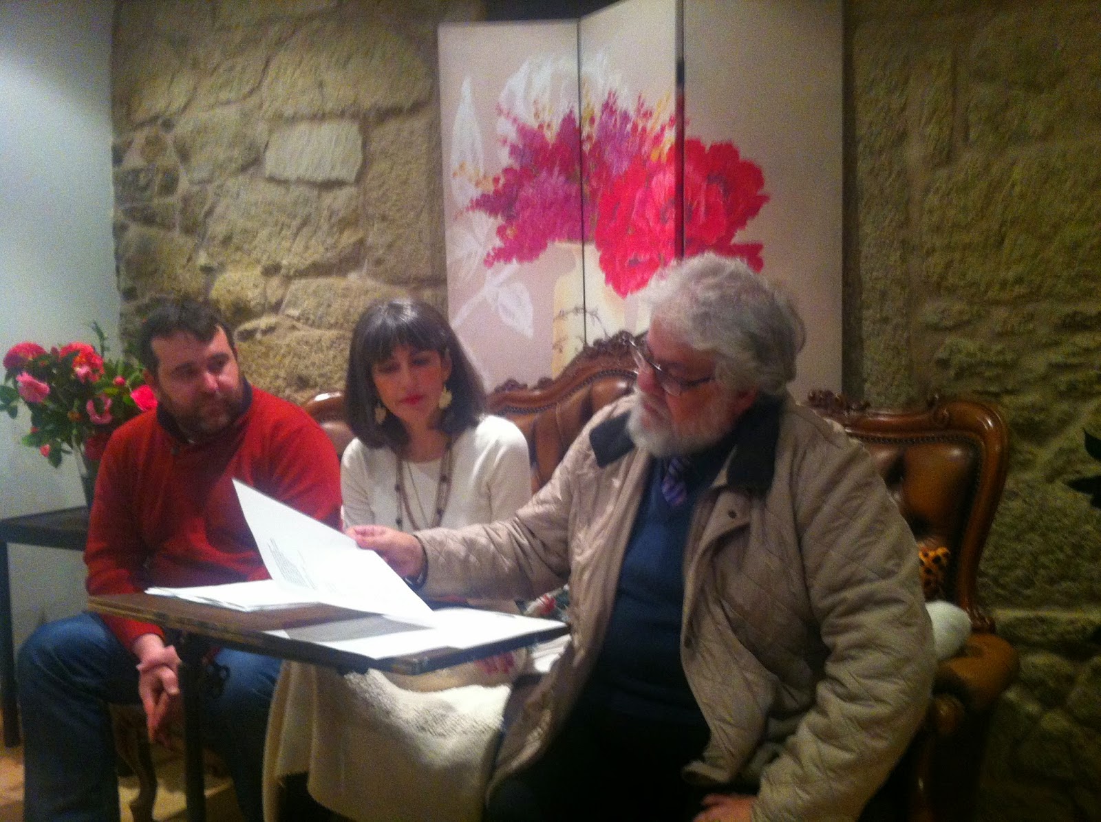 El poeta y miembro del jurado, Alexander Vórtice, Silvia Rodríguez -copropietaria de La Saleta- y Augusto Guedes, participante en el concurso. |